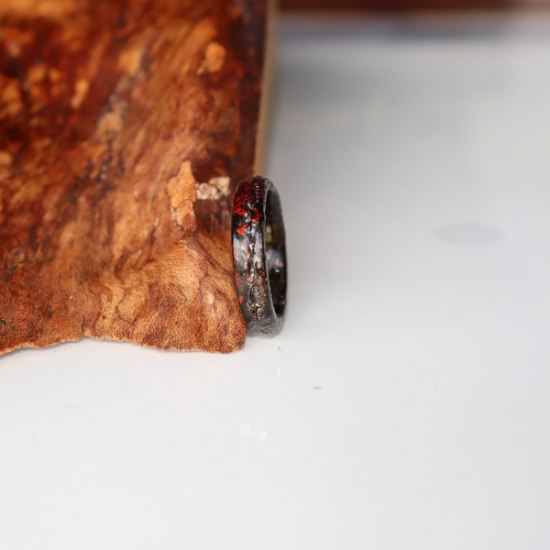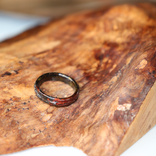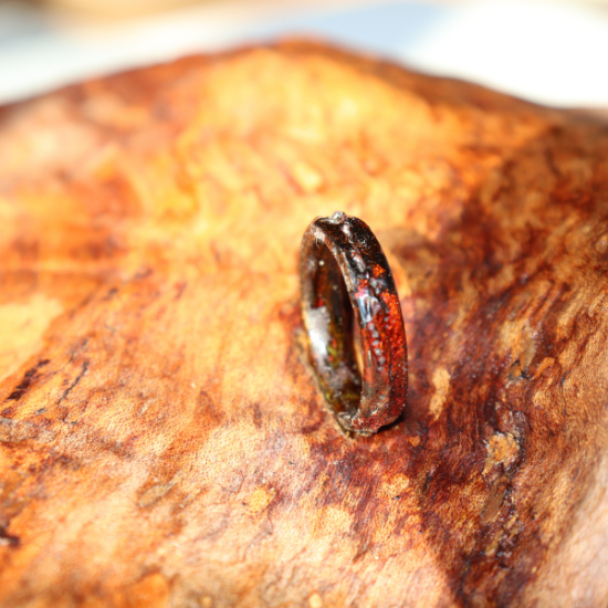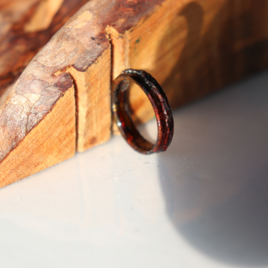 余り、広がっていないと思える木の指輪。デザイン性や割れる心配など、さまざまな要因を考慮した商品です。漆やCAボンドなどのコーティング技術により、強度が向上させています。手漉き和紙で撚ったです。