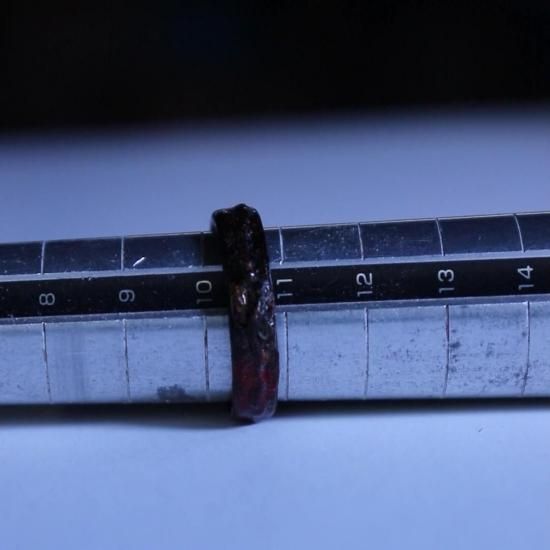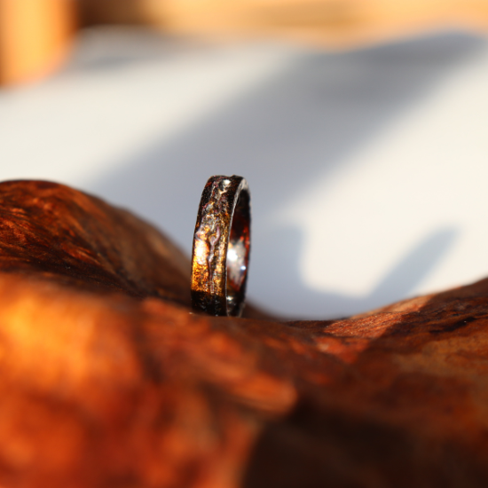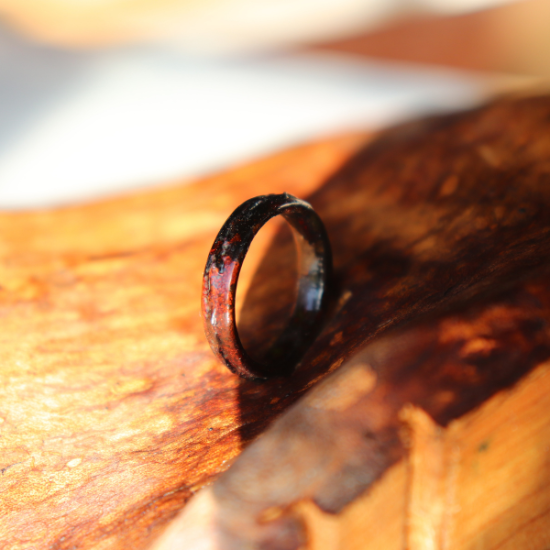 朝の強めの光を受けて、撮影しています。茶色系が強いように映像では感じられるかもしれませんが、パッと見た目には黒っぽくみえます。リングに銀箔を貼り、高温焼却で変化させ、漆で固めています。