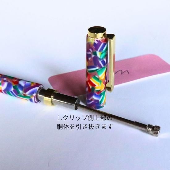 ミニペン(回転式)!全長わずか9.3cmのコンパクトサイズで、手のひらにすっぽり収まる使いやすさが魅力です。回転式なので、上部を回しながら芯を簡単に押し出せます。ペンパーツはアメリカ製で、交換芯は4cタイプをご使用いただけます。